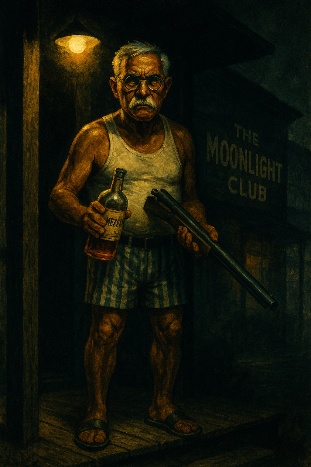 Dr. Garza was a small man - barely five foot three if I were to guess - and looked to be in his mid to late sixties. Short-trimmed white-grey hair, mildly disheveled, framed his brown, sun-wrinkled face. A full, white moustache hid much of his frowning mouth. Round bifocals perched slightly crooked on the tip of his nose, and he wore striped boxer shorts, a white undershirt, and stood in a pair of black sandals. He held a half-empty bottle of Mezcal in one hand and in the other was a worn 12-gauge shotgun pointed at my chest.